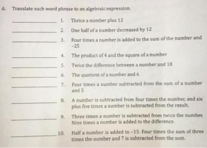 Translating Phrases Into Algebraic Expressions Worksheets